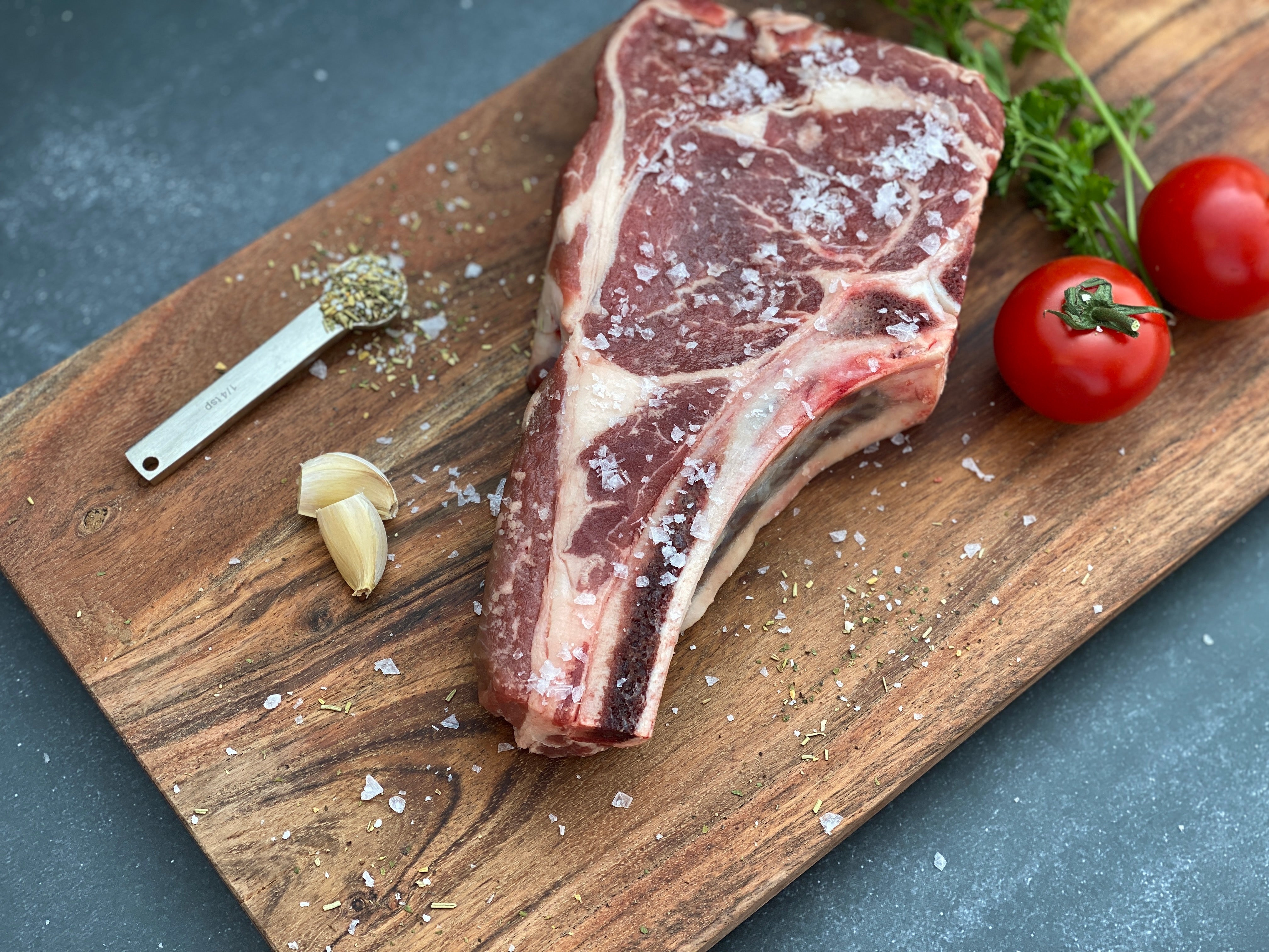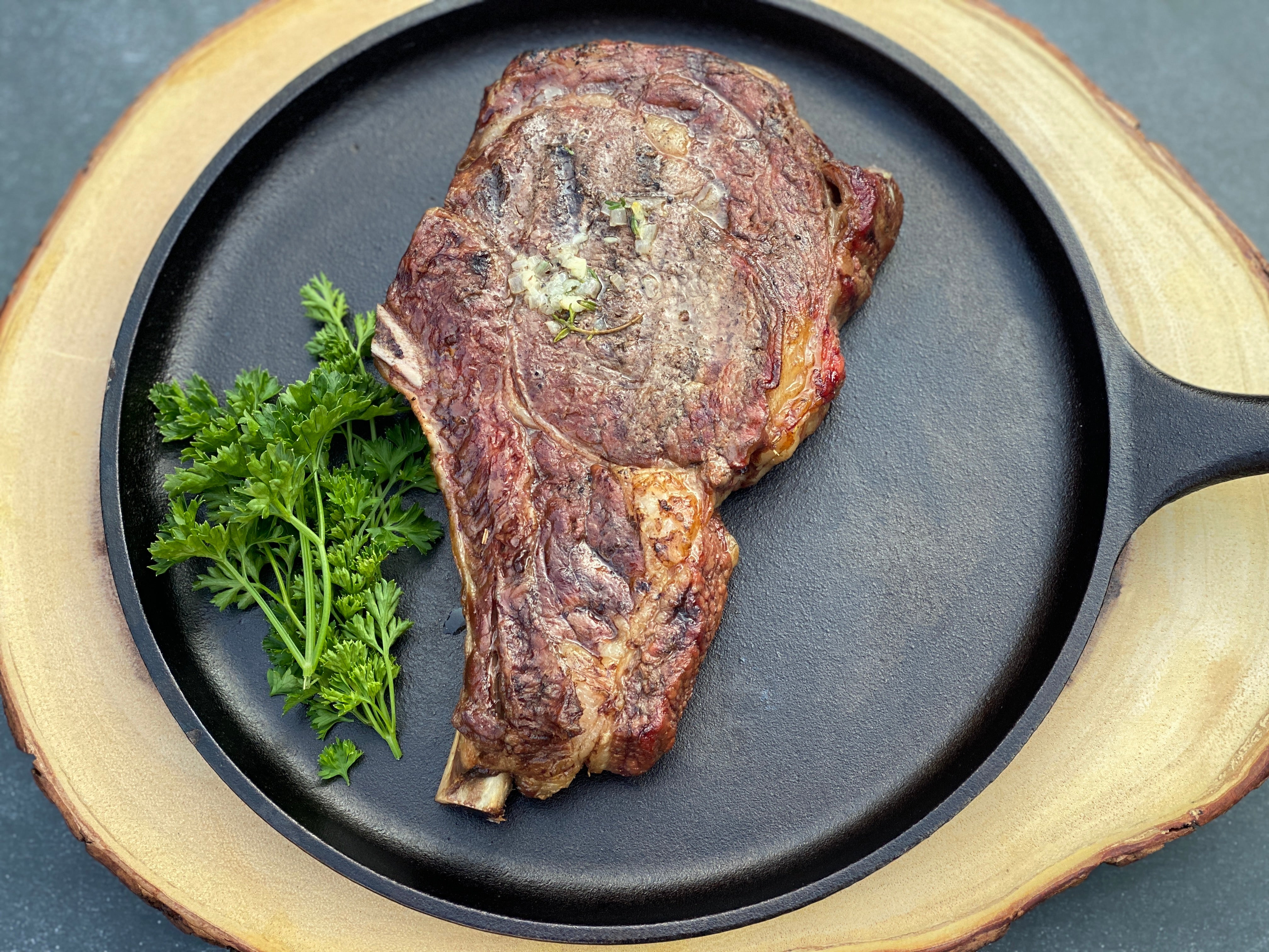 The Cowboy Steak! Our bone-in dry-aged rib eye packs some serious flavor. Cut at 1.5 inches thick, this is a must!