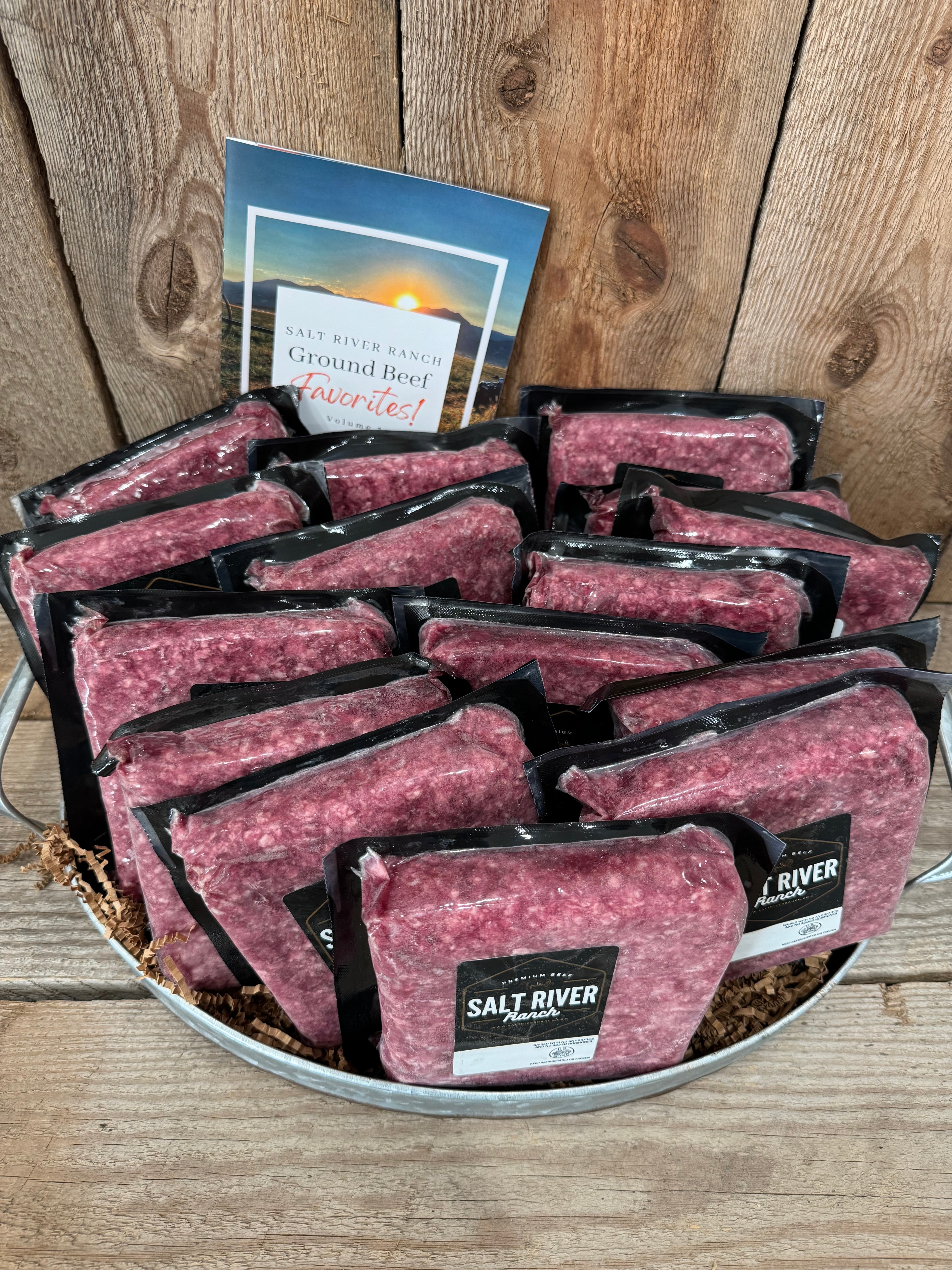 10,15, or 20 lbs of ground beef comes in one pound packages and includes a free Ground Beef Favorites recipe booklet